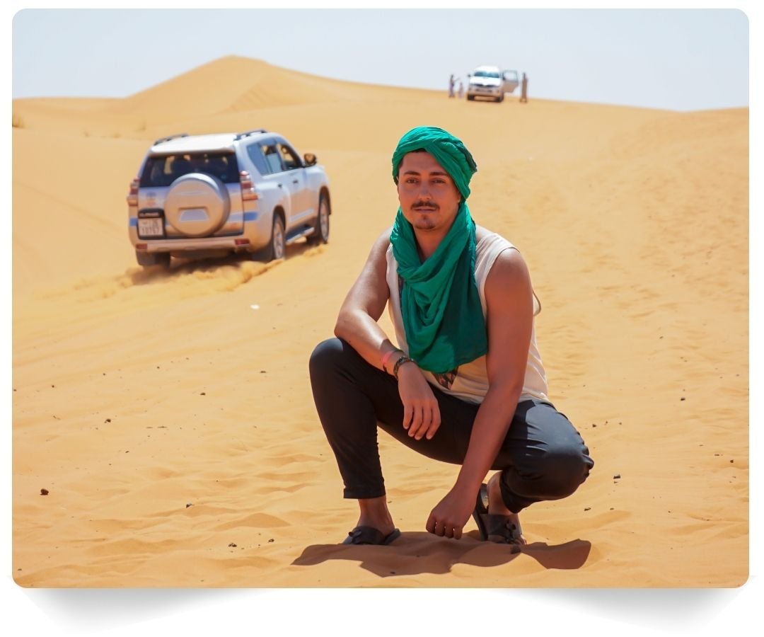 ◉ A las 09:30 nuestro conductor te estará esperando con un 4×4 para comenzar la ruta por el entorno de las dunas de Erg Chebbi. Recorrerás pistas del antiguo rally Dakar, visitarás minas de kohl abandonadas y descubrirás paisajes casi lunares que contrastan con el dorado de las dunas. También tendrás la oportunidad de conocer a familias nómadas que todavía viven en el desierto, entender su forma de vida y compartir un té bajo su jaima.